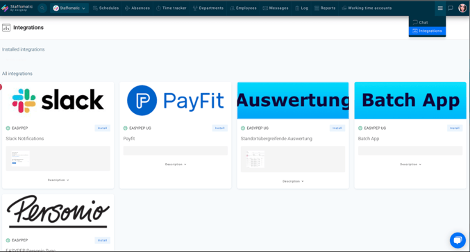 1. go to the Integrations tab in Staffomatic and select the Personio integration. Follow the installation instructions.