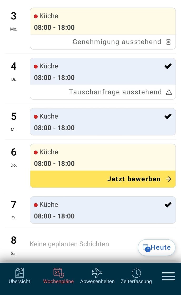 - blaue Schicht mit Haken markiert - Du bist eingeteilt oder Schicht zum tauschen freigegeben